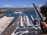 ミズーリ艦橋よりU.S.S.アリゾナ記念館(奥の洋上の白い建物)を撮影